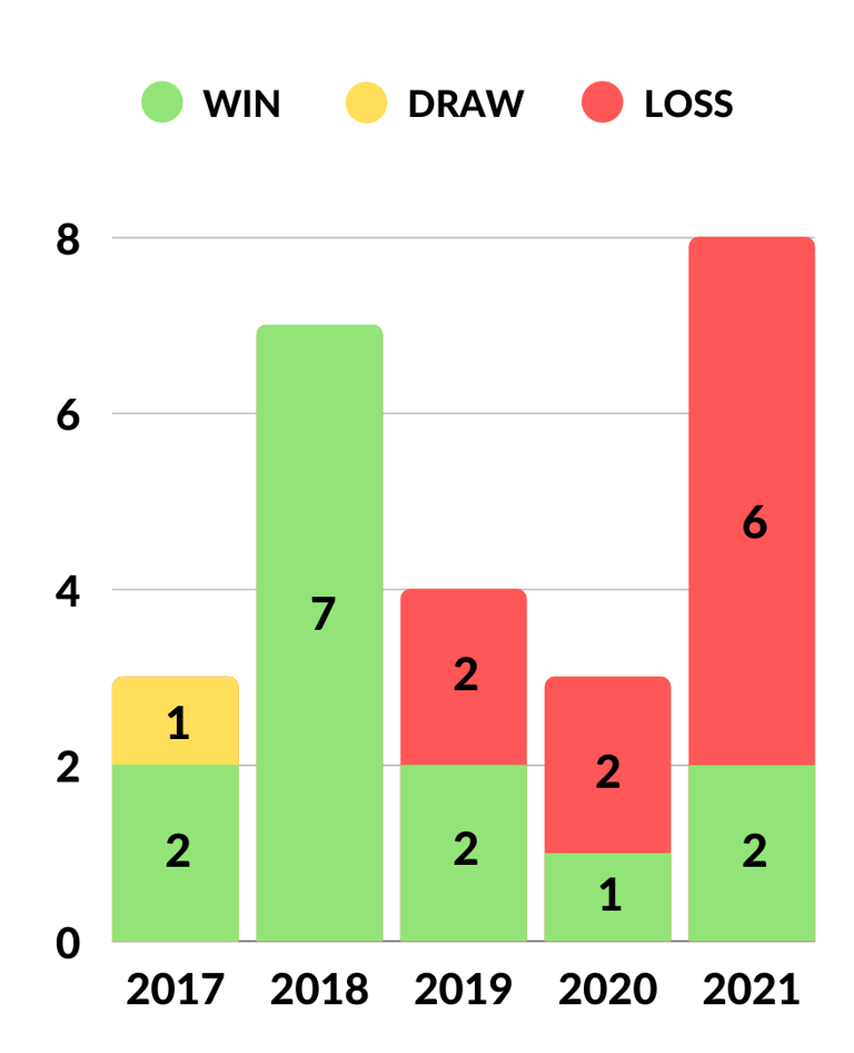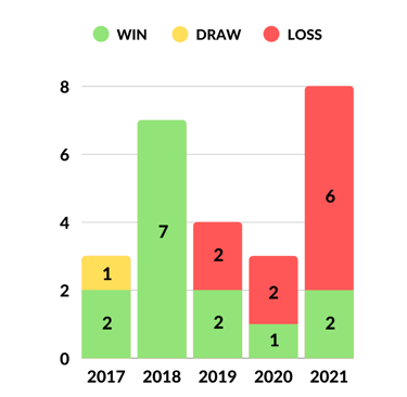 Wins are designated in green on the graph, draws are designated in yellow, and losses are designated in red.